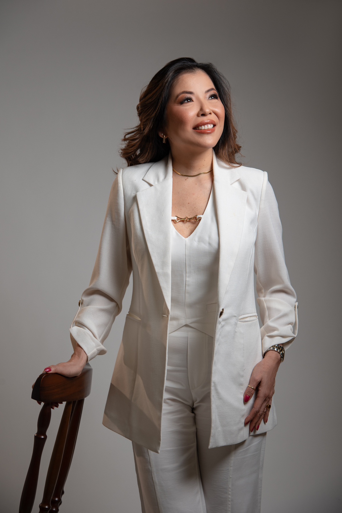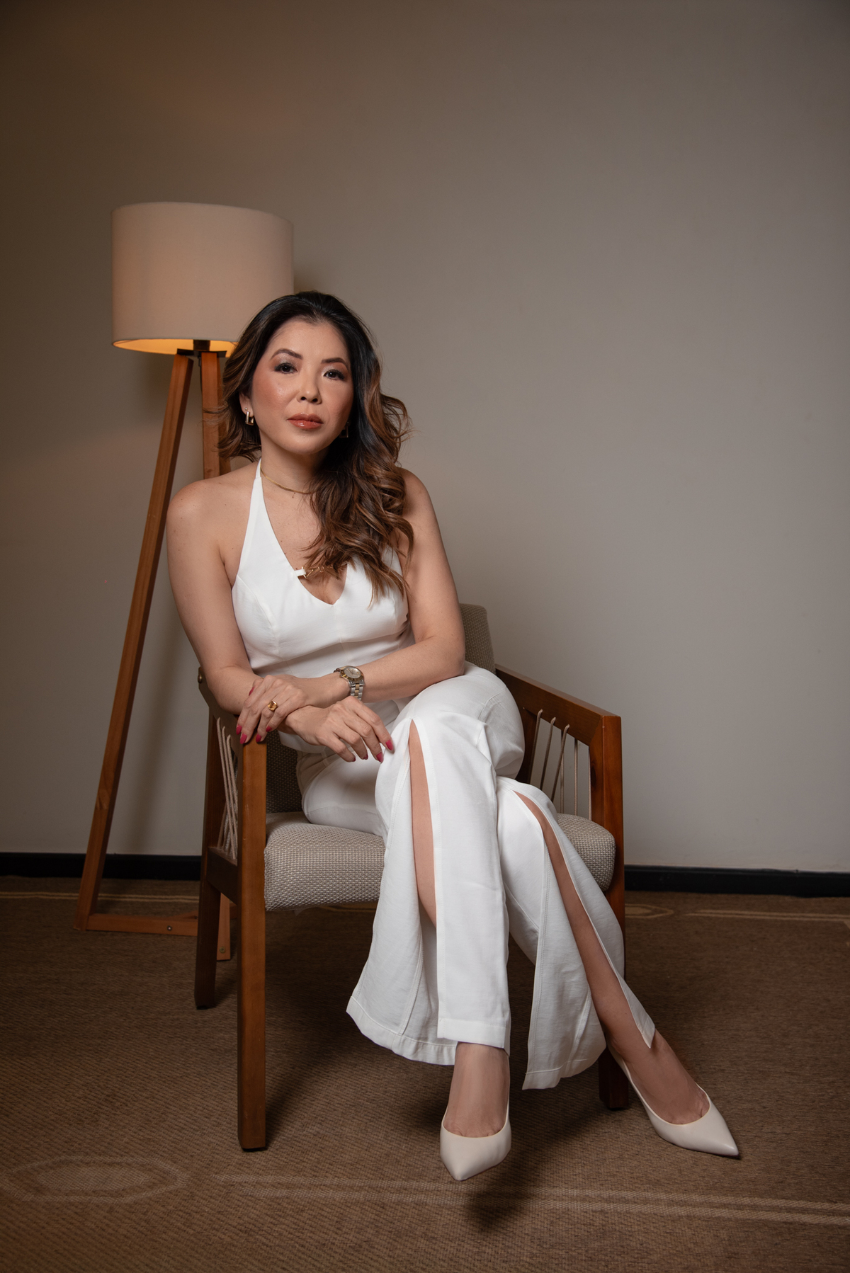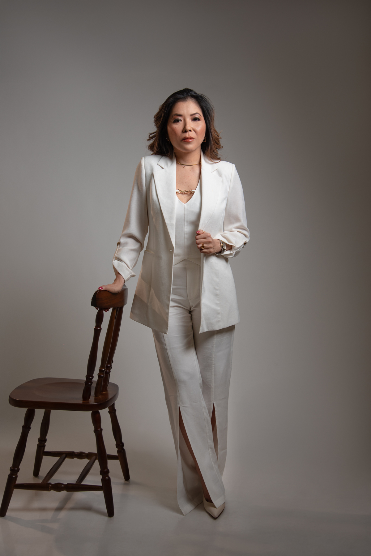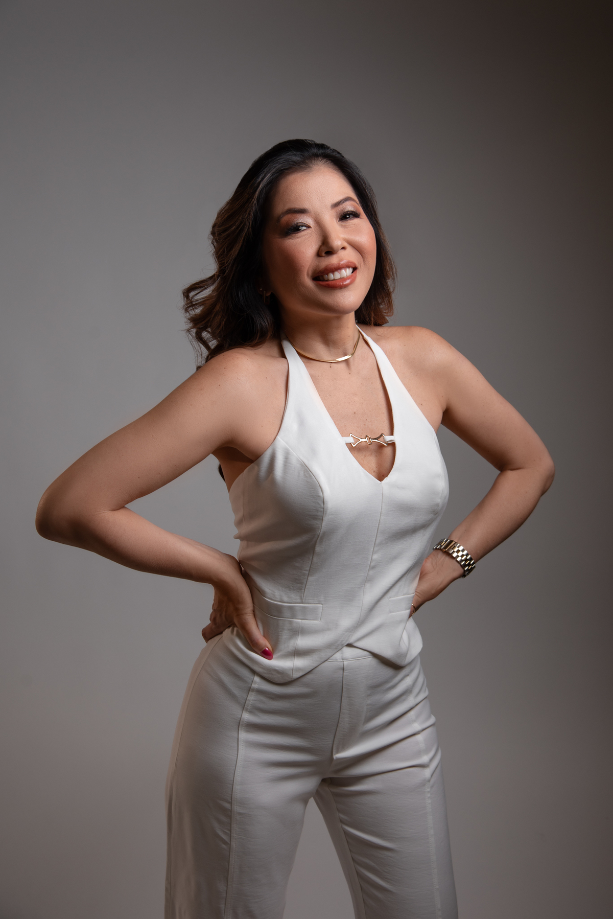 Por ser uma mulher alegre, leve, detalhista e empática, pensamos em um styling que refletisse exatamente quem ela é. Optamos por peças de cores sóbrias e tecidos que comunicam sofisticação, explorando desde o preto (que transmite credibilidade e autoridade), passando pelo branco com linhas retas (que inspira confiança), até o laranja e o linho (que revelam seu lado divertido, carismático e humano).