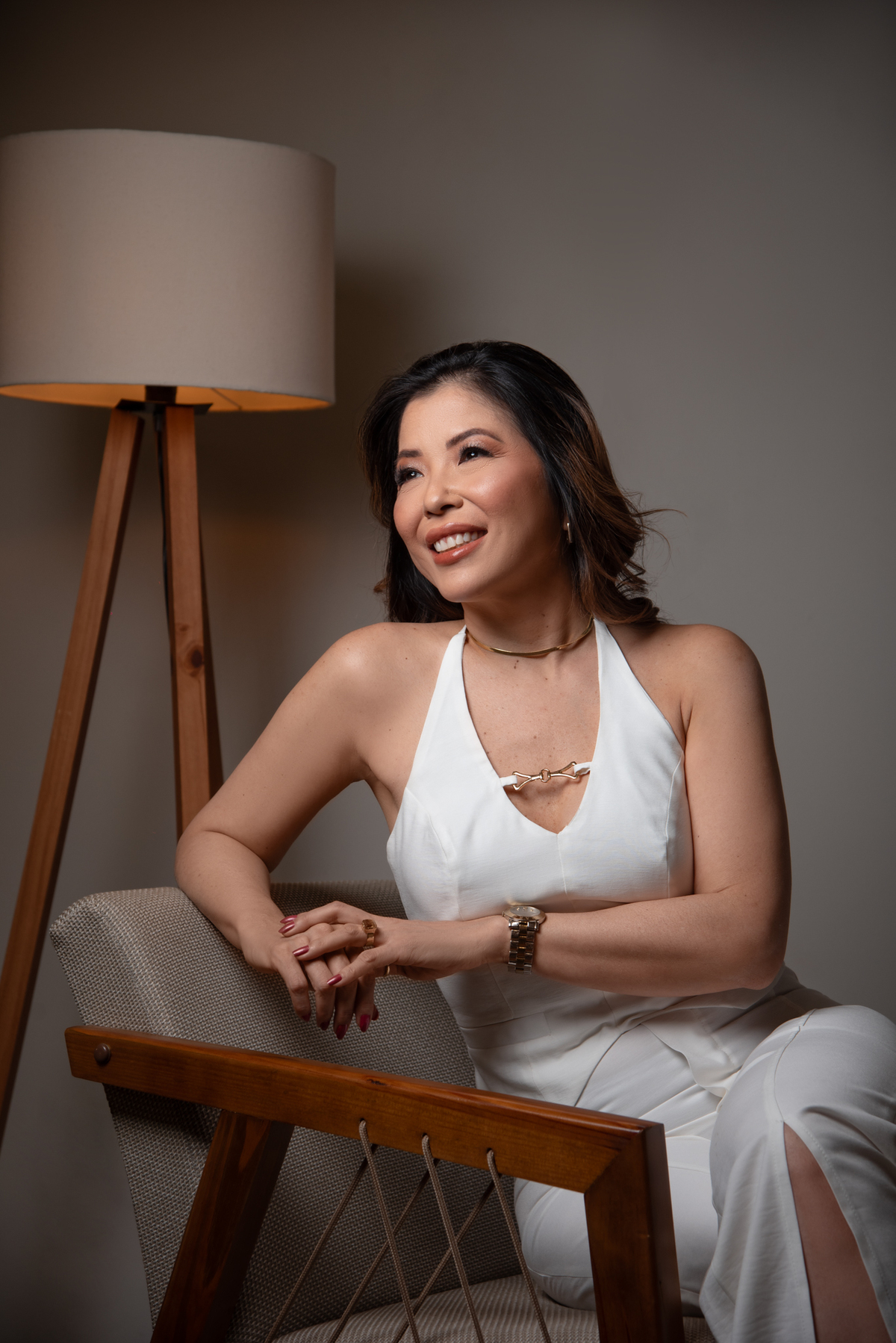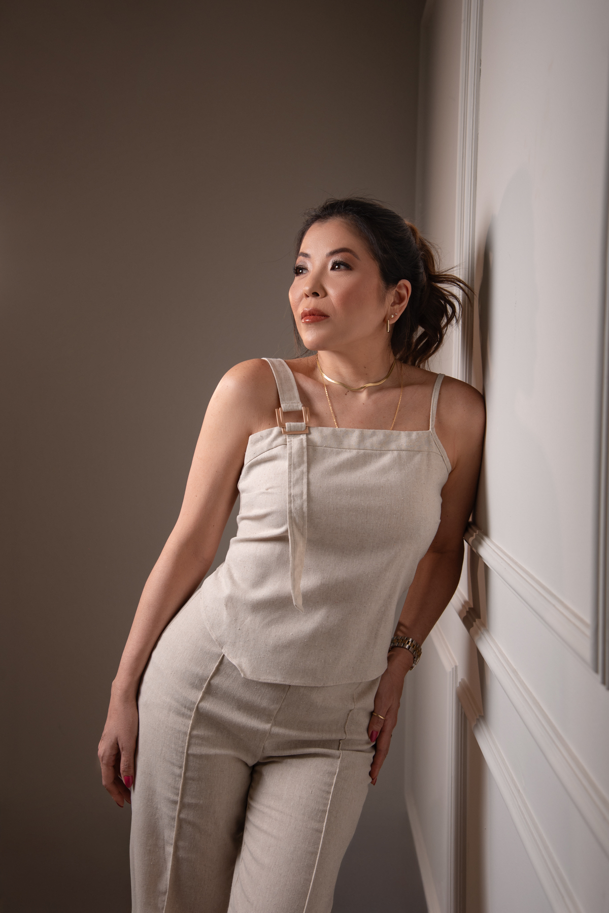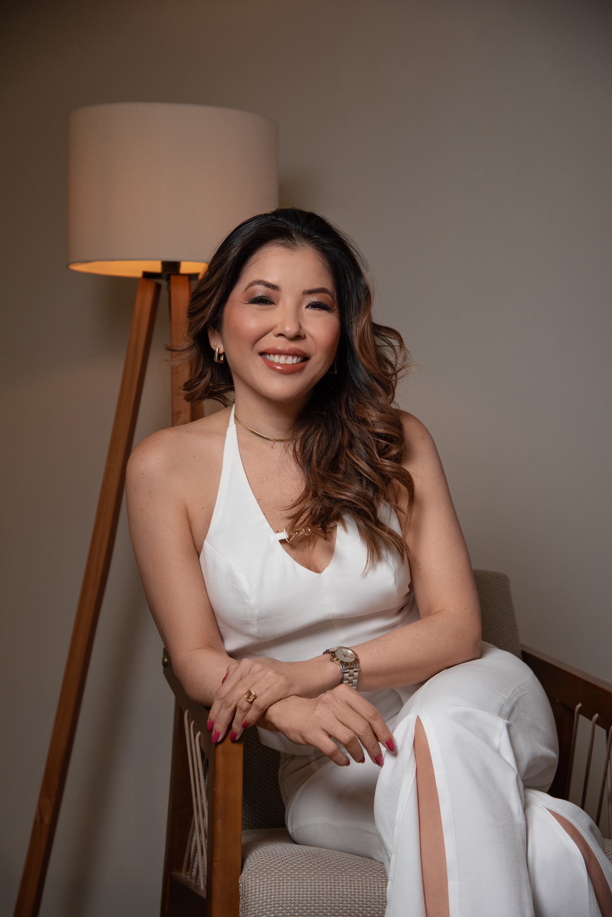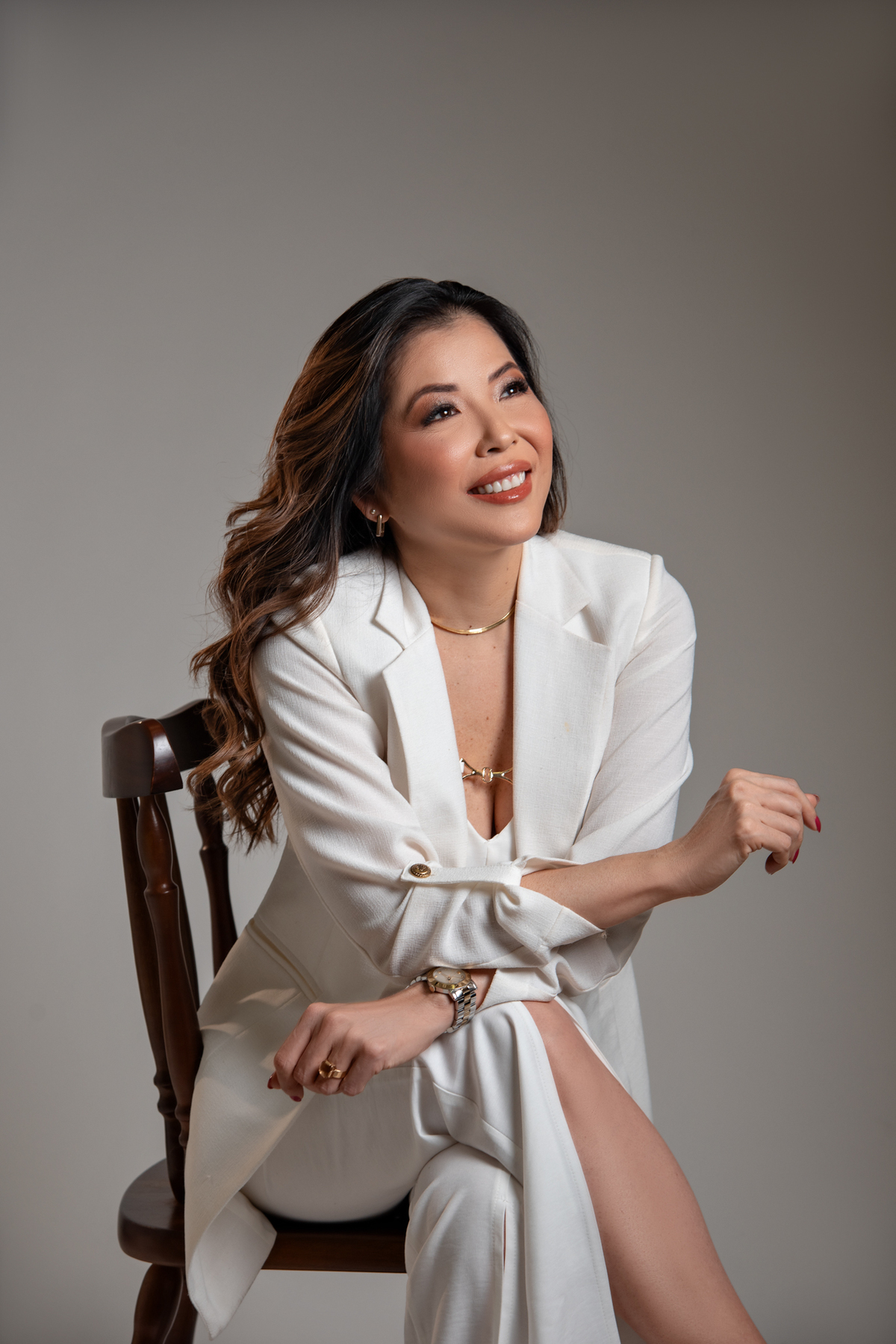 Por ser uma mulher alegre, leve, detalhista e empática, pensamos em um styling que refletisse exatamente quem ela é. Optamos por peças de cores sóbrias e tecidos que comunicam sofisticação, explorando desde o preto (que transmite credibilidade e autoridade), passando pelo branco com linhas retas (que inspira confiança), até o laranja e o linho (que revelam seu lado divertido, carismático e humano).