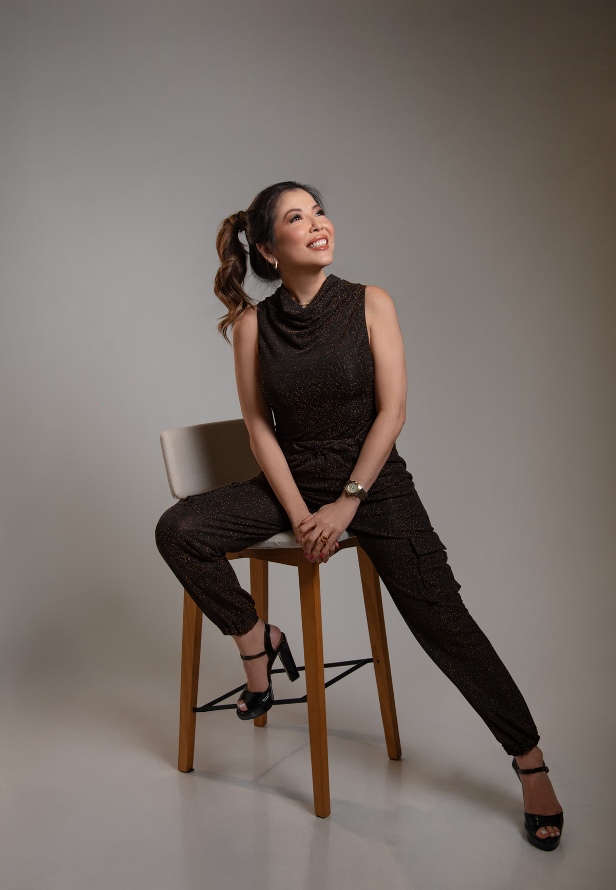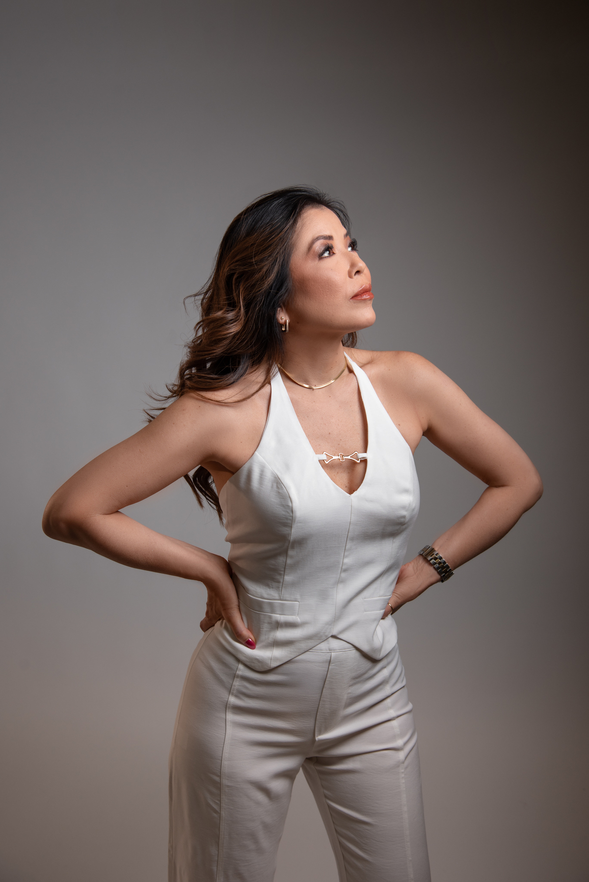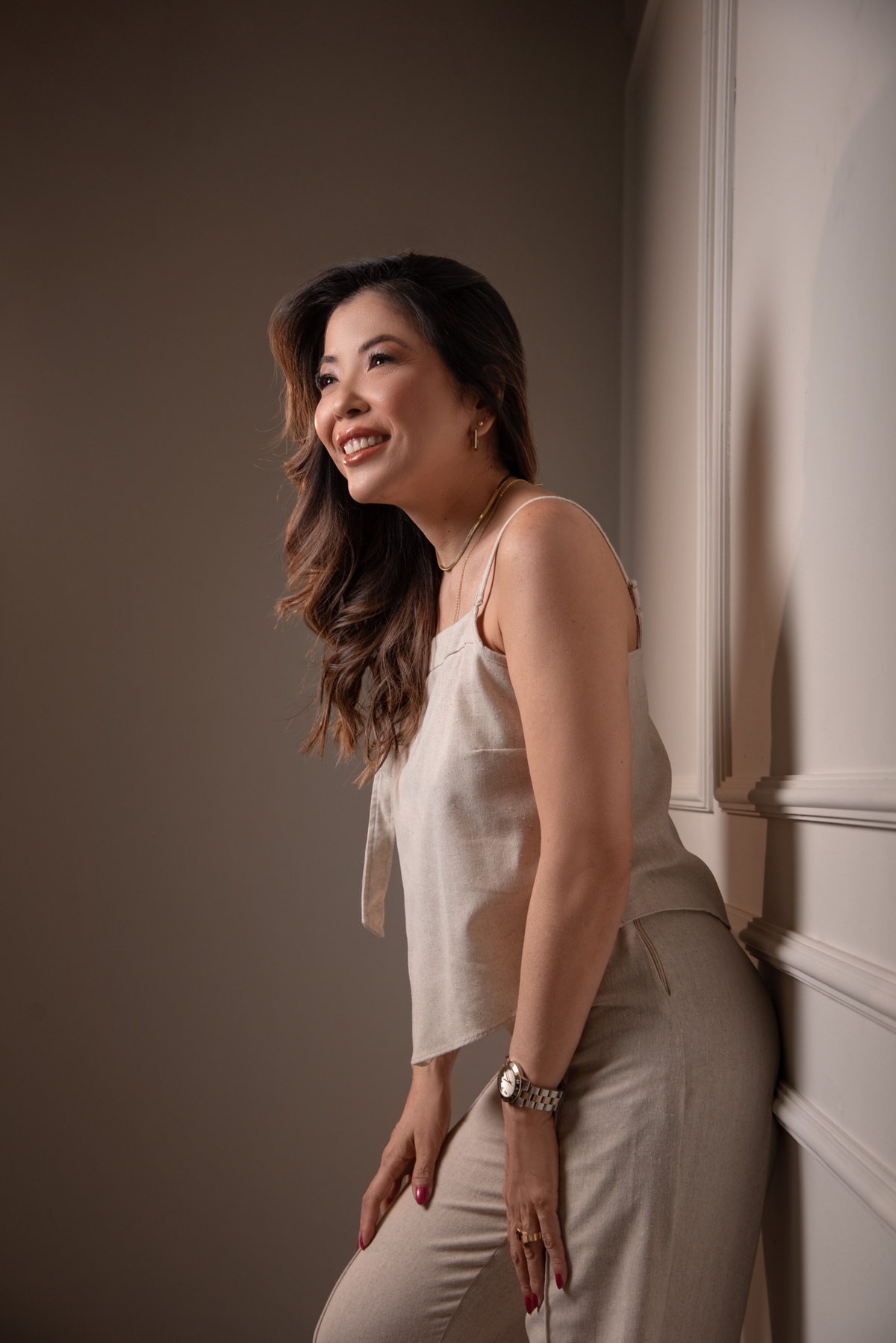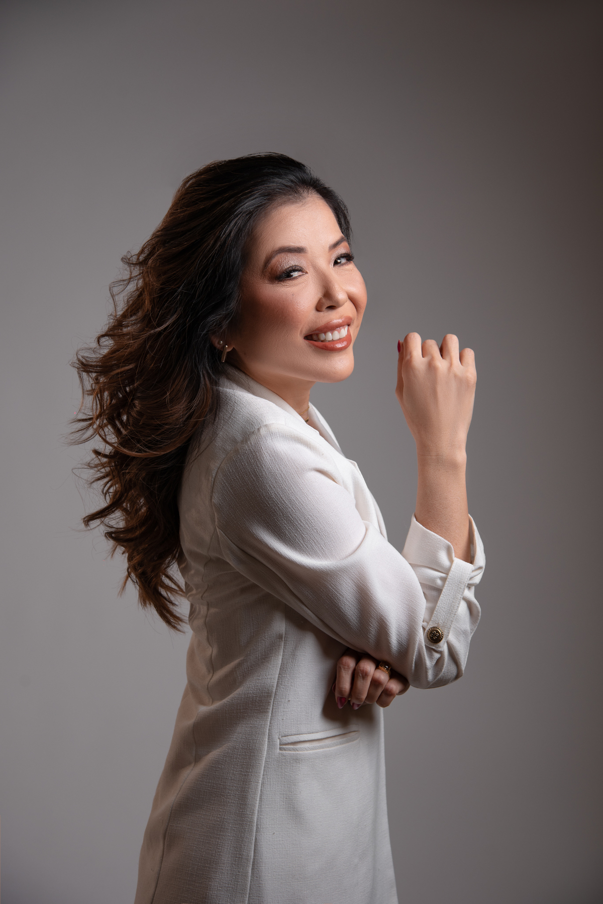 Por ser uma mulher alegre, leve, detalhista e empática, pensamos em um styling que refletisse exatamente quem ela é. Optamos por peças de cores sóbrias e tecidos que comunicam sofisticação, explorando desde o preto (que transmite credibilidade e autoridade), passando pelo branco com linhas retas (que inspira confiança), até o laranja e o linho (que revelam seu lado divertido, carismático e humano).