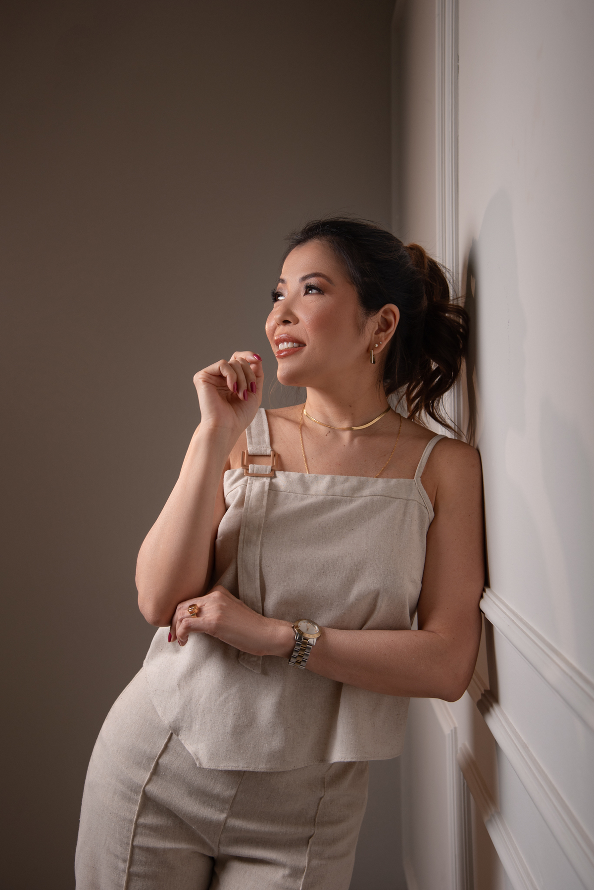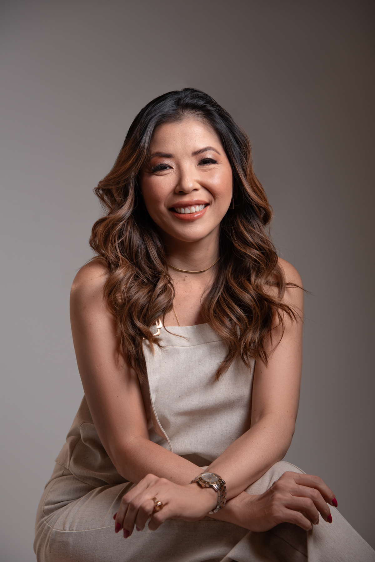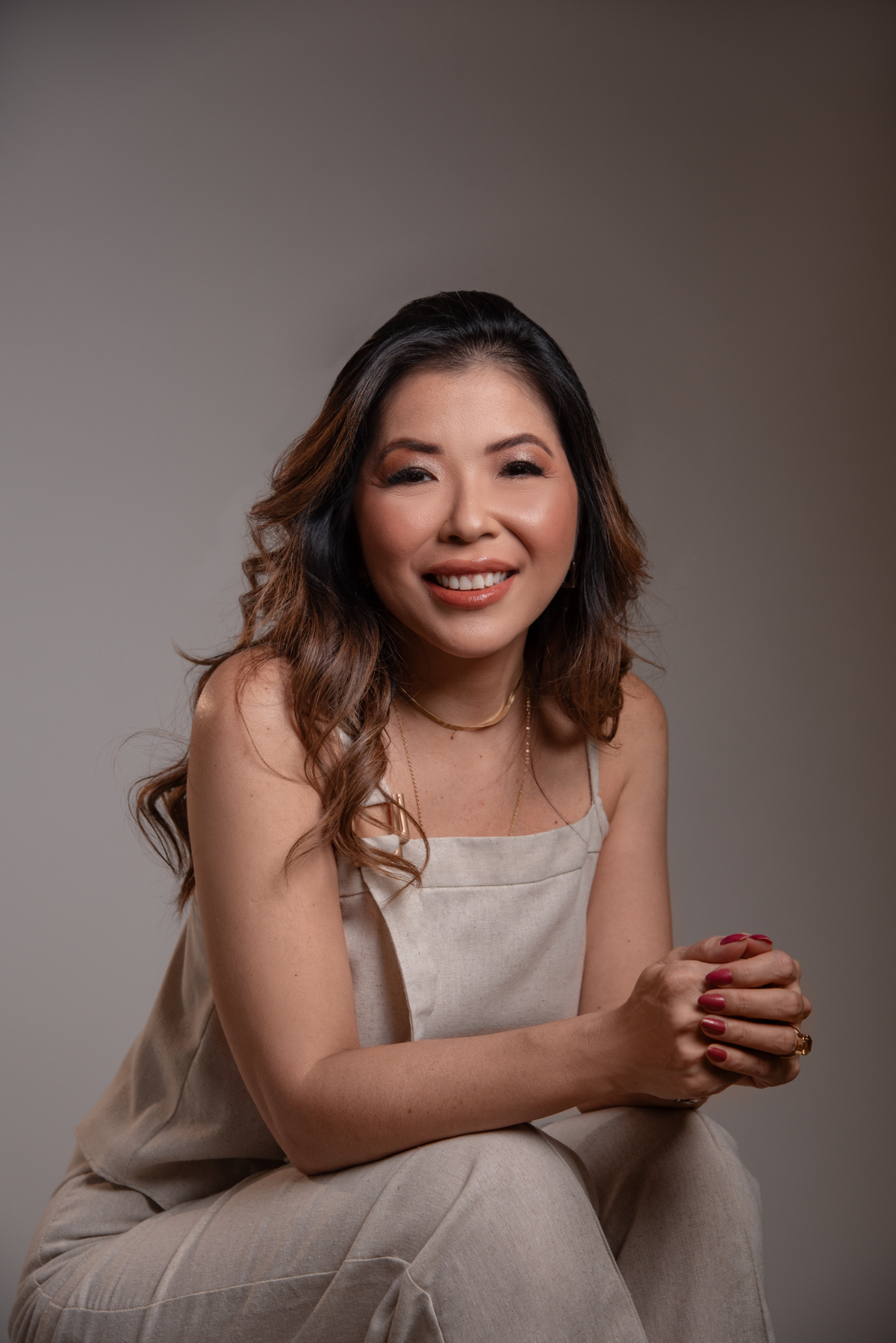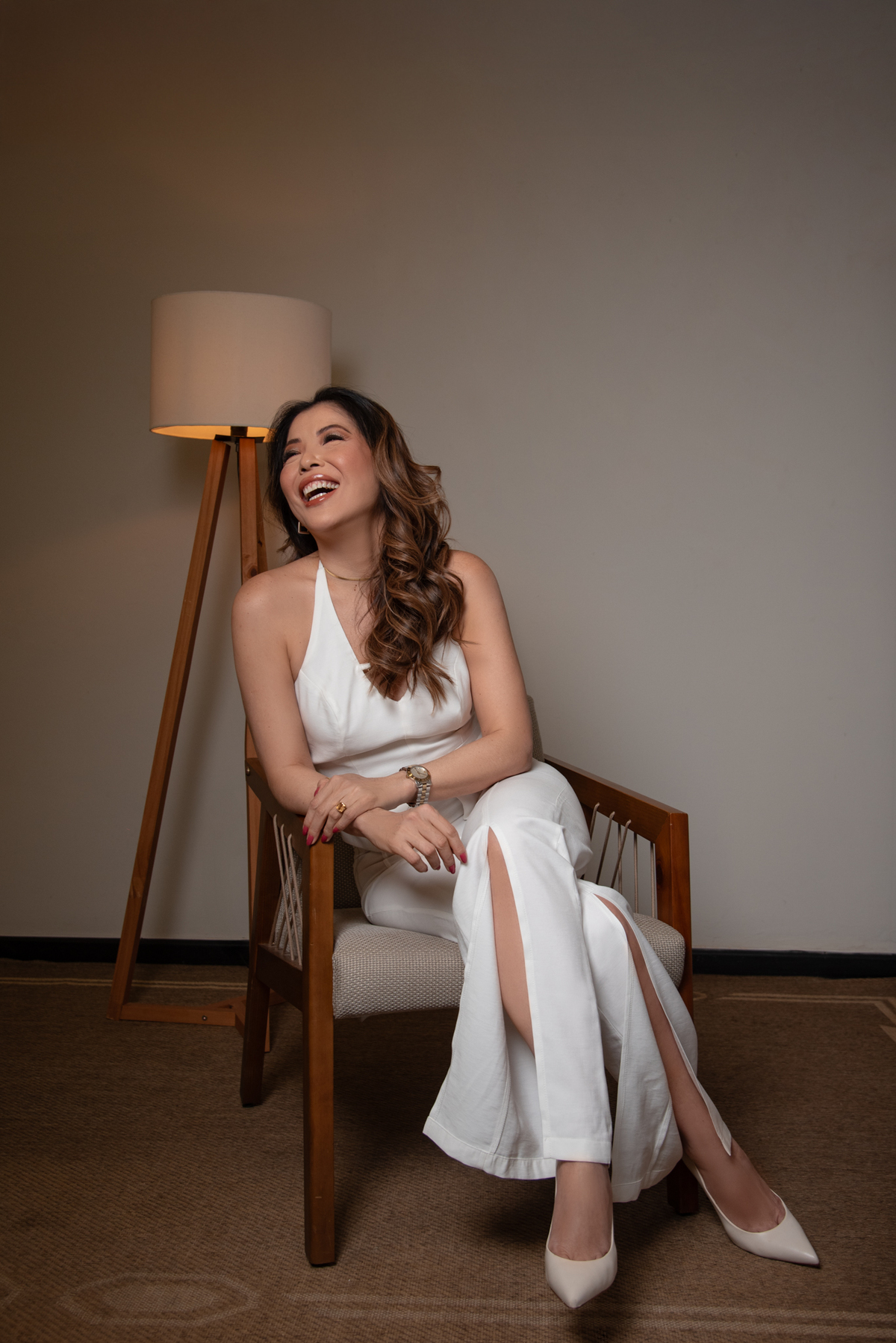Por ser uma mulher alegre, leve, detalhista e empática, pensamos em um styling que refletisse exatamente quem ela é. Optamos por peças de cores sóbrias e tecidos que comunicam sofisticação, explorando desde o preto (que transmite credibilidade e autoridade), passando pelo branco com linhas retas (que inspira confiança), até o laranja e o linho (que revelam seu lado divertido, carismático e humano).